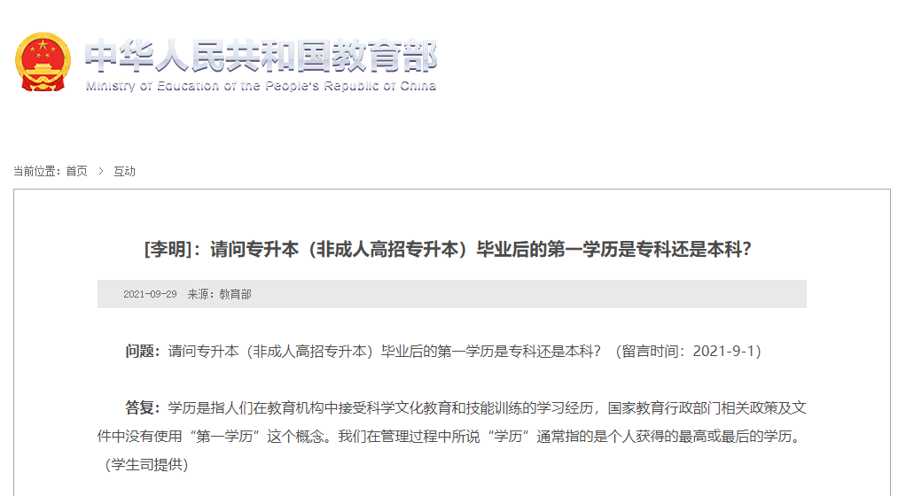 9月29日,教育部针对网友在9月1日提问的“请问专升本(非成人高招专升本)毕业后的第一学历是专科还是本科?”进行答复称: