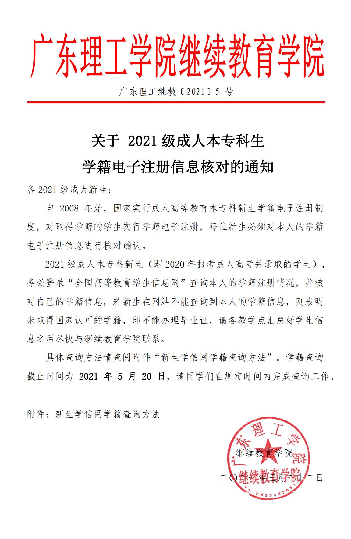 关于 2021 级成人本专科生学籍电子注册信息核对的通知